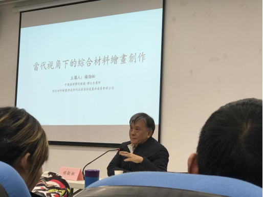 杨劲松教授以“当代视角下的综合材料创作”为题,介绍了在当代视野下综合材料绘画创作发展的现状,以及最新的动态及将要开展的重大艺术活动。然后围绕着艺术创作展开,强调艺术创作者主体的重要性,强调当前是中国最好的发展阶段,是艺术家可以向世界输出的最好时机。杨劲松教授鼓励、激发在座的师生从身边去发现属于自己的材料与艺术语言,去寻找合适的主题,努力创作。