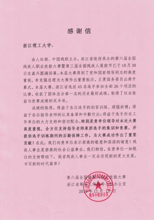近日,第六届全国残疾人职业技能大赛组委会向公司发来感谢信,表彰唐泓、何霞、蓝天宁等三位教师。