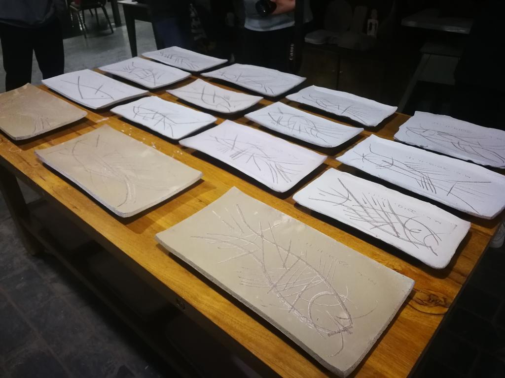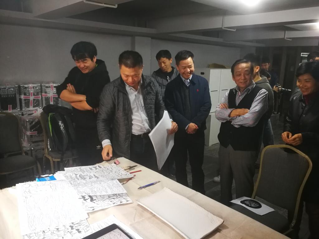 11月13日,艺术大师韩美林教授来到公司陶艺工作室进行陶艺教学指导并现场刻盘创作100件作品,副董事长许慧霞接见并亲切交流,公司党政班子陪同。韩美林对员工的作品进行了指导、点评,并亲自进行刻盘创作,他为今天定的目标是100件作品。他站在工作台前,手执刻刀,陶盘是纸,刻刀为笔,运气抖腕,屑沫纷飞,一气呵成,挥洒自如地进行创作。不知不觉中,工作台前已经围满了老师和员工们,大家凝神屏气,目不转睛地围观大师的创作,生怕错过分毫的精彩细节。