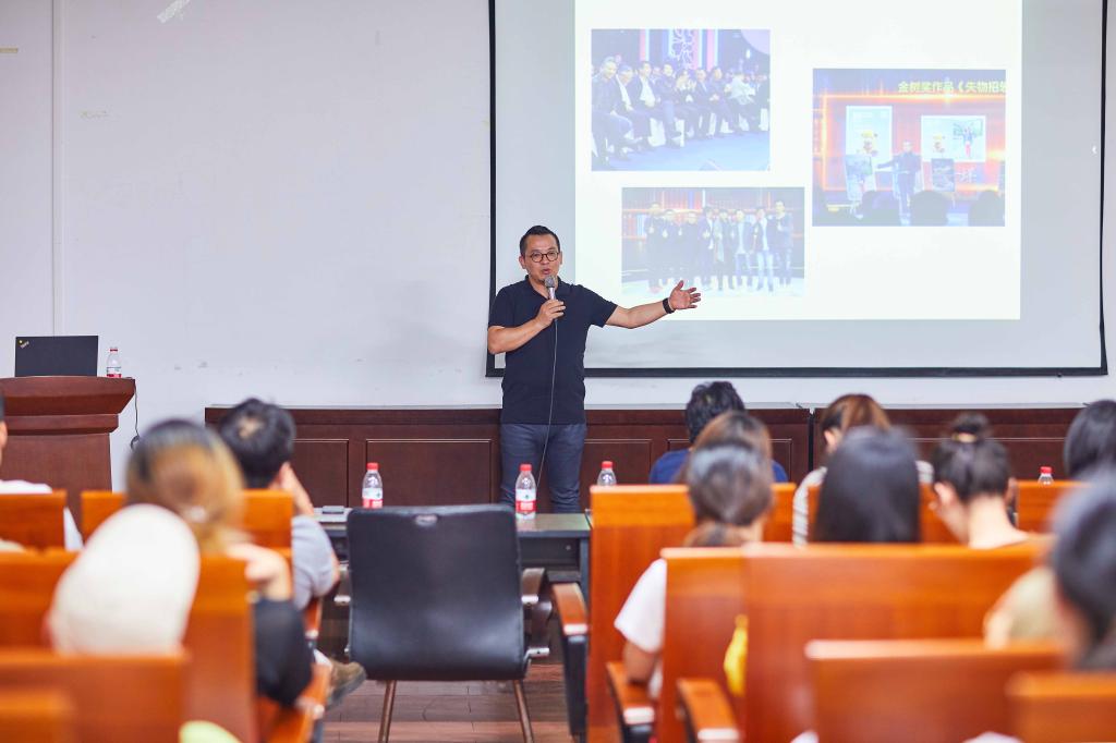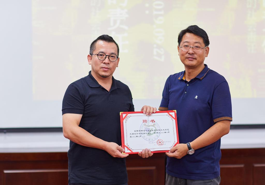 2019年9月27日上午,中国版协装帧艺术委员会常务委员、深圳市平面设计协会秘书长、原著名艺术家韩湛宁先生受副经理周景崇教授邀请,赴公司讲座。经理朱旭光教授出席并为韩先生颁发兼职教授聘书,副经理周景崇、经理助理刘杨、数字媒体系、视觉传达系共150余位本研员工、教师共同聆听韩先生讲座,讲座围绕“设计、责任”展开,韩先生旁征博引,既有历史传承,又包涵艺术深情,他声情并茂,妙语连珠,现场欢声笑语,时时博得阵阵掌声,大家沉浸在艺术思考、设计展望、设计初心、设计师的责任担当之中,充满正能量。