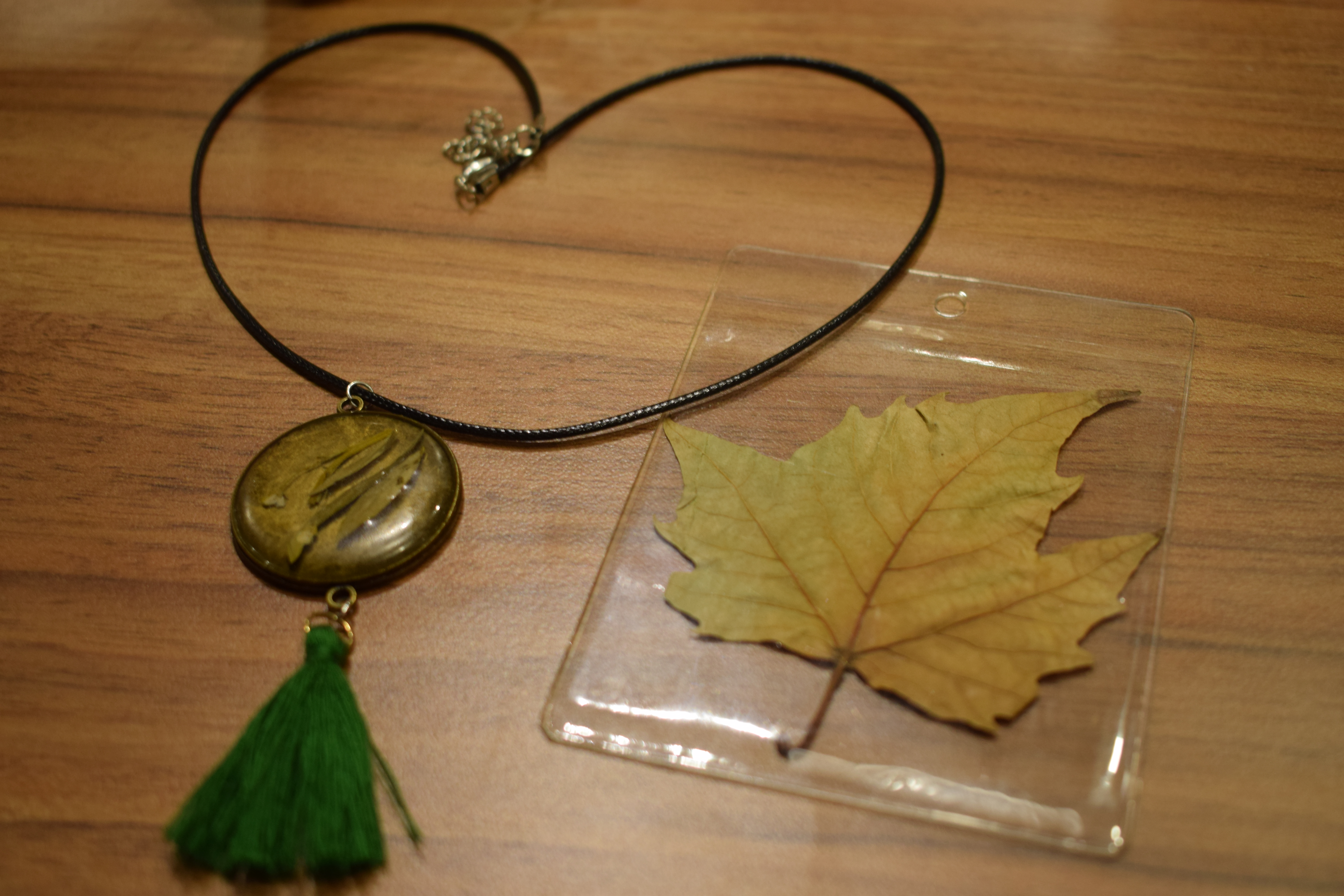 杨慧敏和杨昕是艺术与设计专业的员工,她们将树叶镶入吊坠,制作出一串串精致的挂坠和耳环。