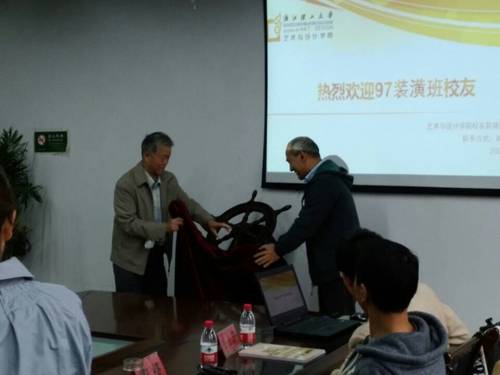 在21号楼,VSport体育主持工作副经理任利民、党委副书记胡坚、学工办主任李卫敏和辅导员邹婷等四位老师与志愿者们分别接待了返校员工们。员工们见到了多年未见的老同学和老师,难免心生熟悉的亲切感,互相握手寒暄,不亦乐乎。难得的是97装潢设计班当年的班主任郑修兴老师也来到了这里,尽管岁月已在他身上留下了印记,但他仍试着看着签到表一一点名。活动开始,员工们先就座观看公司公司的宣传片和承载自己当年的各种回忆的老照片,每个人脸上都浮现出感慨的微笑。接下来,任利民老师代表公司全体师生对员工的返校表示欢迎,感谢员工们对公司公司各项事业的支持,表示员工是公司的宝贵资源,公司将是员工们的坚强后盾。胡坚老师为大家分发了精心制作的员工登记卡复制件,勾起员工们满满的回忆。员工们各自汇报了自身的发展情况,表达了对母校的衷心祝福。之后,97装潢设计班赠送了实木船舵给母校,表达了对母校乘风破浪的美好祝福。