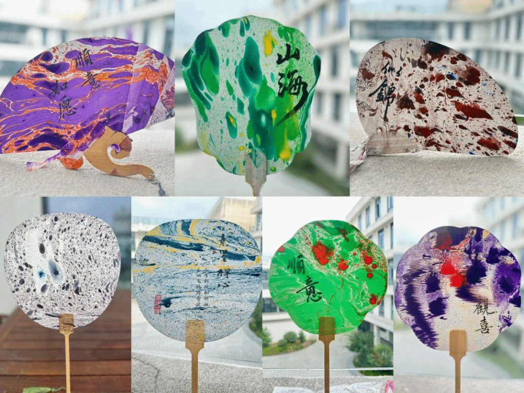 活动现场,大家先认真观看漆扇制作方法的视频,接着大家拿到材料后都跃跃欲试。分工会贴心地为老师们准备了五个水桶,方便大家自行挑选配色,同时还邀请了艺设公司22级数媒专业陈依琳、环艺专业罗琪嵘,这两位擅长书法的员工为老师们在扇面上题字。当老师们挑选好自己心仪的颜色后,将颜料滴入水中轻轻搅动,接着再把团扇浸入水中,通过旋转或摇摆的形式,扇面上就形成了独特的图案。由于制作漆扇时的漆料用量、滴速、水流方向和速度不同,导致每一把漆扇都是独一无二的,十分具有纪念意义。