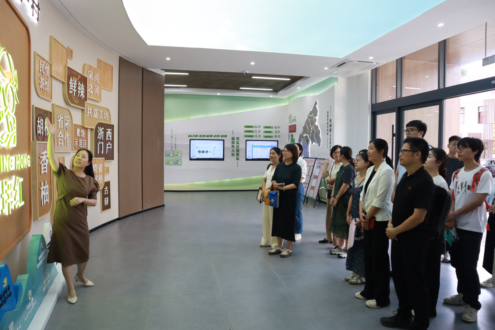 活动结束后,与会人员参观了小白石村党建广场和白石镇草坪村展厅,并就实际设计需求进行了具体对接。展厅内系统呈现了艺设公司多年服务白石镇的历程与成果,从党建广场设计到农副产品包装开发,各类帮扶成果实物与图文资料一一陈列,生动展现了“设计赋能乡村”的实践成效。此外,展厅还重点展示了公司刘洁、张淑霞老师带领的2025年暑期社会实践团队在白石镇开展设计服务时的成果,进一步体现了校地合作共建的延续性与深度。