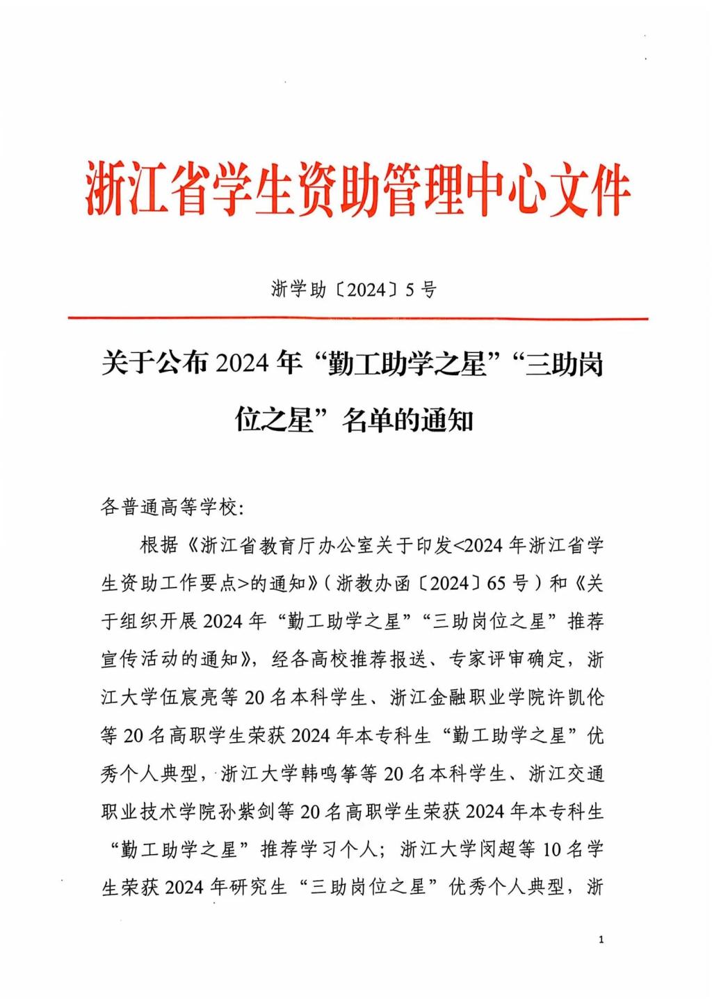 为培养员工热爱劳动、自强不息、创新创业的奋斗精神和社会责任意识,深入挖掘自立自强、诚信励志、感恩奉献、勇于担当的优秀典型,引导广大受助员工争当德智体美劳全面发展的社会主义建设者和接班人。近日,浙江省员工资助管理中心公布2024年“三助岗位之星”名单,公司研究生陈东获评浙江省“三助岗位之星”推荐学习个人名单。