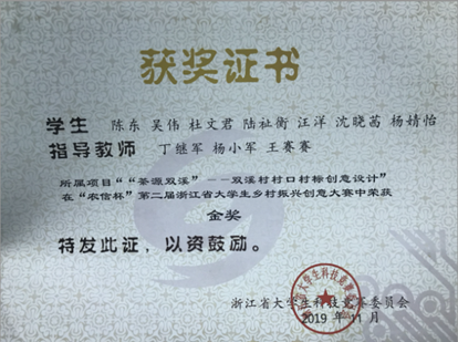 2018年,跟随实践团走进浦江开展学习“郑义门”廉洁家风家规社会实践,后续3年,深入基层,组建科研、实践团队,专注于通过艺术专业特长赋能乡村振兴。为数百个传统村落搭建数字博物馆,将珍贵的乡村资源留存、传承下去。实践成果在多个科研竞赛中取得优异成绩:浙江省第十二届“挑战杯·宁波·江北”老员工创业计划竞赛一等奖、“农信杯”第二届浙江省老员工乡村振兴创意大赛设计比赛金奖、“建行杯”第六届浙江省国际“互联网+”老员工创新创业大赛二等奖等奖项。