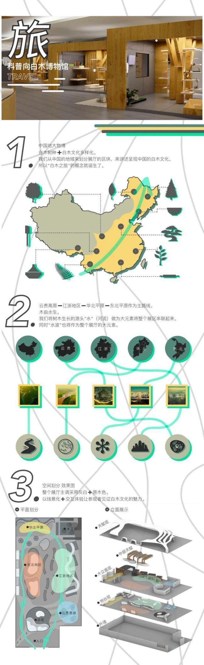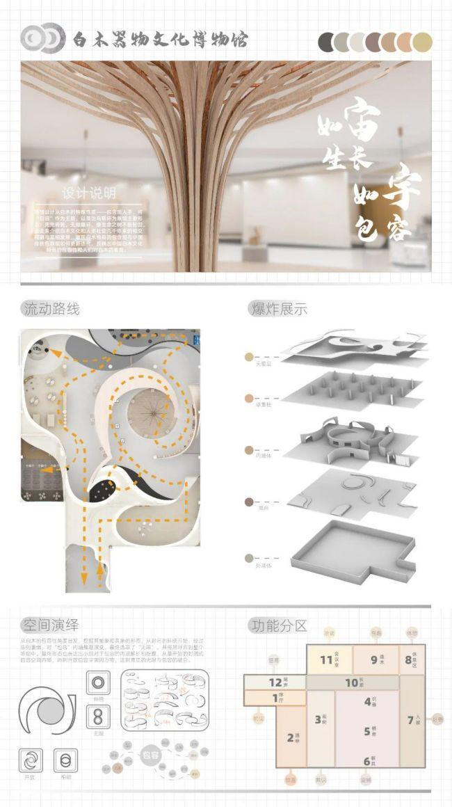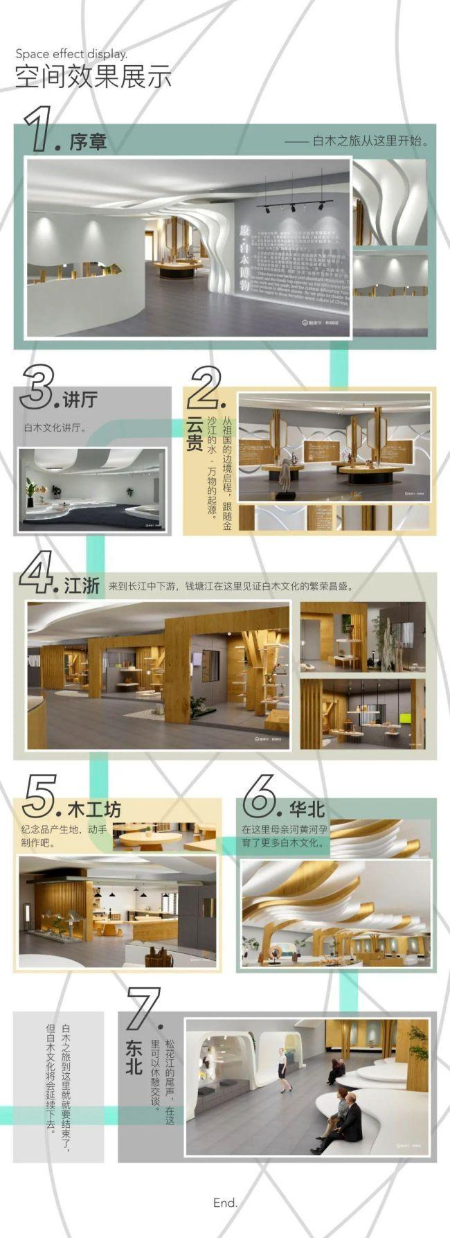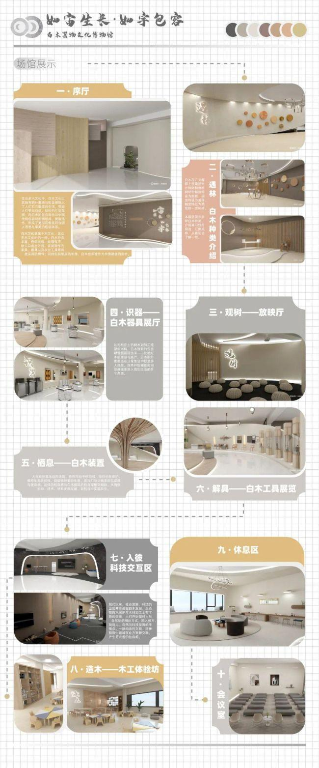 本展览从白木的特殊性质——包含观入手,将“包容”作为主题,以莫比乌斯环为展馆主要形态,小组认为:无限即包容。由此来介绍白木文化和人类社会几千年来的相交相融与互相发展,展现白木独有的包含观与中国传统包容观如何更新迭代,形成了更加完备且符合国人思想与审美的包容体系,从而使白木文化为人们接受。本展览主分四大区域,追随时间线索分别展览自然生态下的白木、人类社会中的白木、科技发展下的白木以及多功能区域。四大区域下又细分九个展间,依次是白木种类介绍:遇林、白木文化放映室:观树、白木器具展览:识器、大型艺术装置:栖息、白木工具等展览:解具、白木科技方面展示与交互:入彼、木工体验坊:造木,以及休息区与会议室。