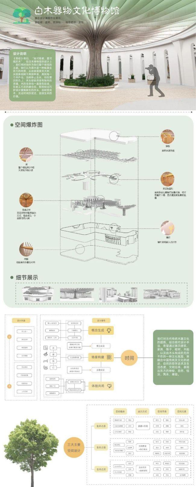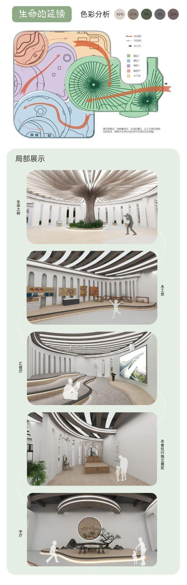 我们分为三个主题场馆生命之基,生命之续,生命之流,通过生命来表现时间,在第一个场馆中,我们在场馆中搭建了两颗相互呼应的生命之树,展示内容主要以珍贵的白木工艺品为主,在第二个场馆中,我们通过衣食住行的分区,来塑造了以白木为基材的生活氛围,引起人们的共鸣,在第三部分是我们的生命之流,主要以交流汇报体验为核心功能,有两个分区,一个是木工坊,另外一个是公共报告厅。我们三个主题相互关联,一脉相承,共同表现白木文化的源远流长。