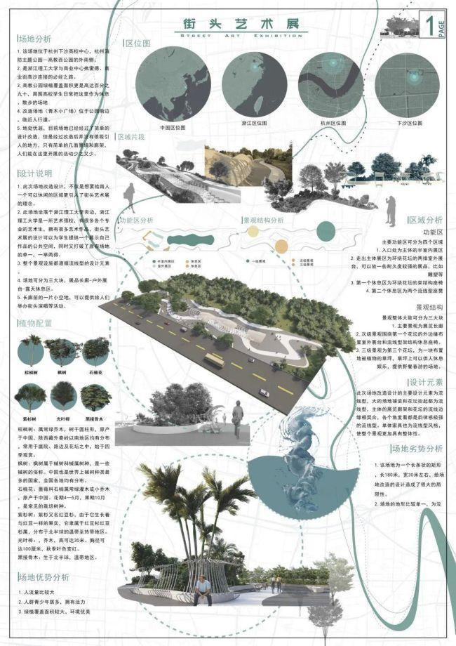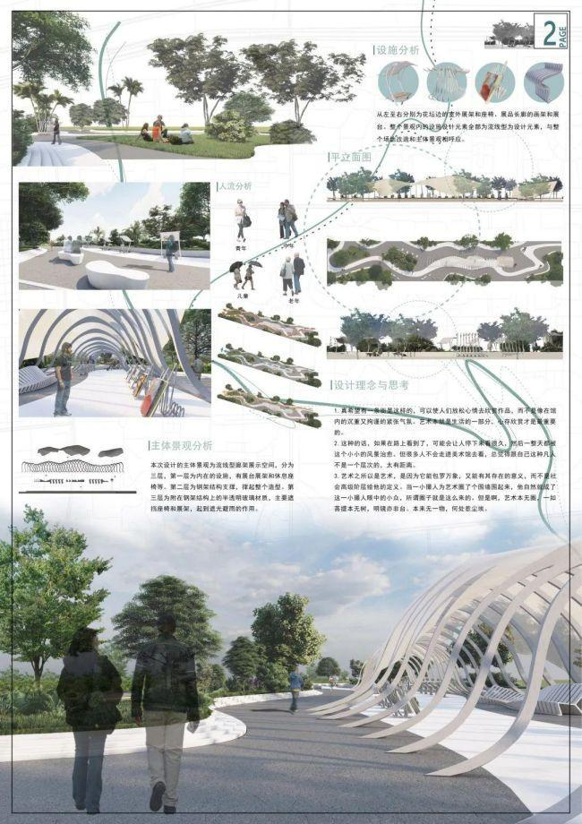 此场地坐落于理工大学旁边,公司有很多各个专业的艺术生,拥有很多艺术作品,街头艺术展的设计可以为员工提供一个展示自己作品的公共空间,同时又打破了原有场地的单一,一举两得。整个景观设施都遵循流线型的设计元素。场地可分为三大块,展品长廊-户外展台-露天休息区。长廊前的一片小空地,可以提供给人们举办街头演唱等活动。