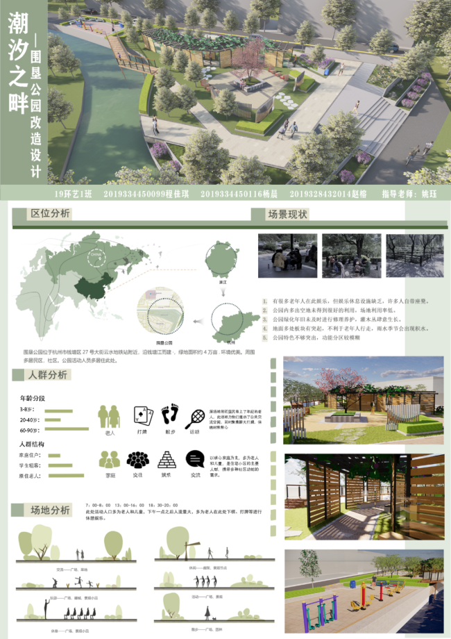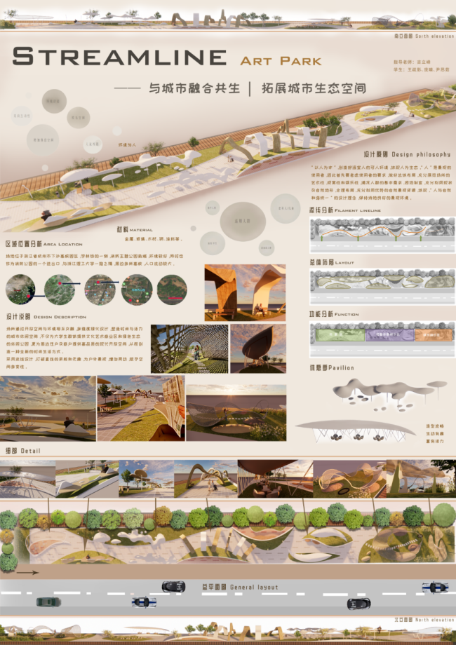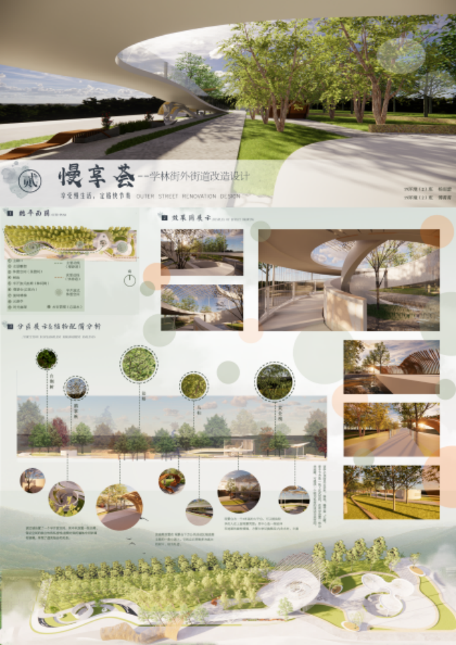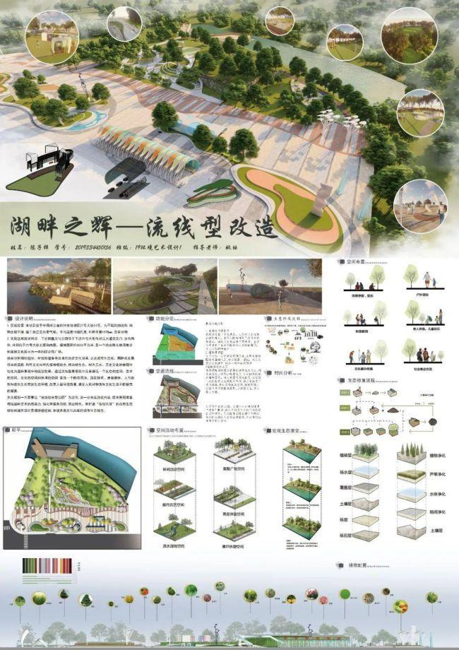 设计者:陈子烨指导老师:姚珏设计说明:本次规划一方面要以“流线综合型公园”为定位,进一步充实游览内容,提高景观质量,増强园林艺术的感染力,强化其服务功能,突出特色,来打造“雅俗共赏”的自然生态绿地和城市滨河景观游憩空间,体现具有文化品味的城市生态概念。