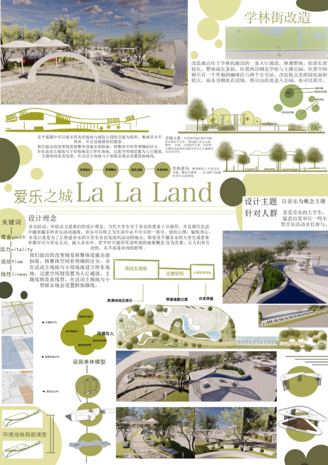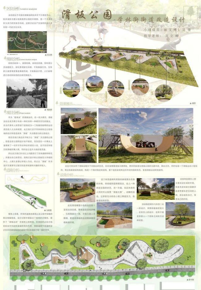 设计说明:作为“帕来品的滑板运动在一些大城市,滑板运动正成为青少年的一种时尚和一种都市文化的象征。在当代青年人的带领下逐渐成为一门有趣面新鲜的运动成功进入大众的视野。此次我们关于学林街街边公园场地的设计则是选择用“滑板”为主题进行的公园设计。