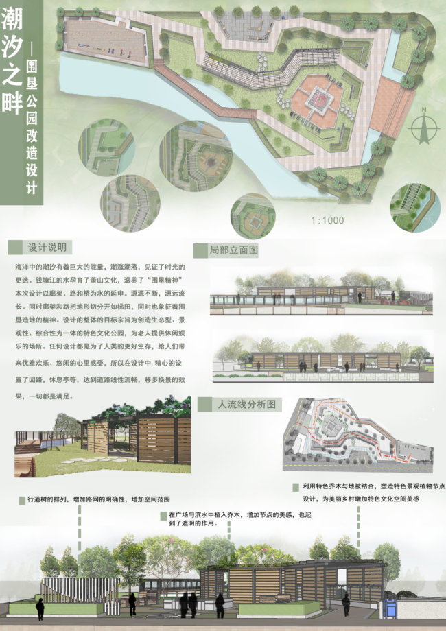 设计者:程佳琪 杨晨 赵榕指导老师:姚珏设计说明:海洋中的潮汐有着巨大的能量,潮涨潮落,见证了时光的更迭。钱塘江的水孕育了萧山文化,滋养了“围垦精神”本次设计以廊架、路和桥为水的延申。源源不断,源远流长。同时廊架和路把地形切分开如梯田,同时也象征着围垦造地的精神。设计的整体的目标宗旨为创造生态型、景观性、综合性为一体的特色文化公园,为老人提供休闲娱乐的场所。任何设计都是为了人类的更好生存,给人们带来优雅欢乐、悠闲的心里感受,所以在设计中.精心的设置了园路,休息亭等,达到道路线性流畅,移步换景的效果,一切都是满足于人类工作之余的放松和休闲。