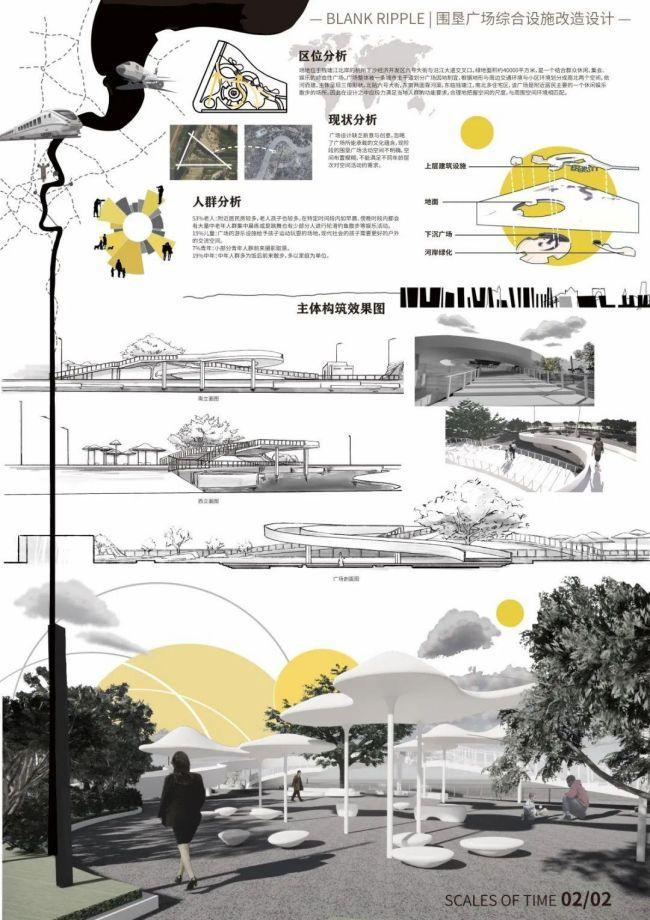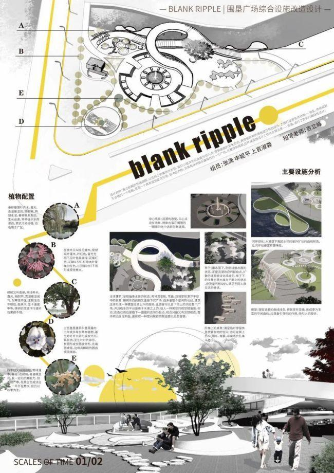 设计说明:通过前期的现场调研,以及网上的案例分析,决定以曲面为切入点,挖掘曲面的变化形式,再根据原有场地进行规划设计,力图打破原有场地单一、杂乱、场地规划不合理的一个局面,营造一个具有视觉引导、视觉冲击力的,又具有休闲娱乐趣味性的一个广场。从整体到局部,在环境设施设计上结合主题元素——涟漪,对环境进行设计改造。