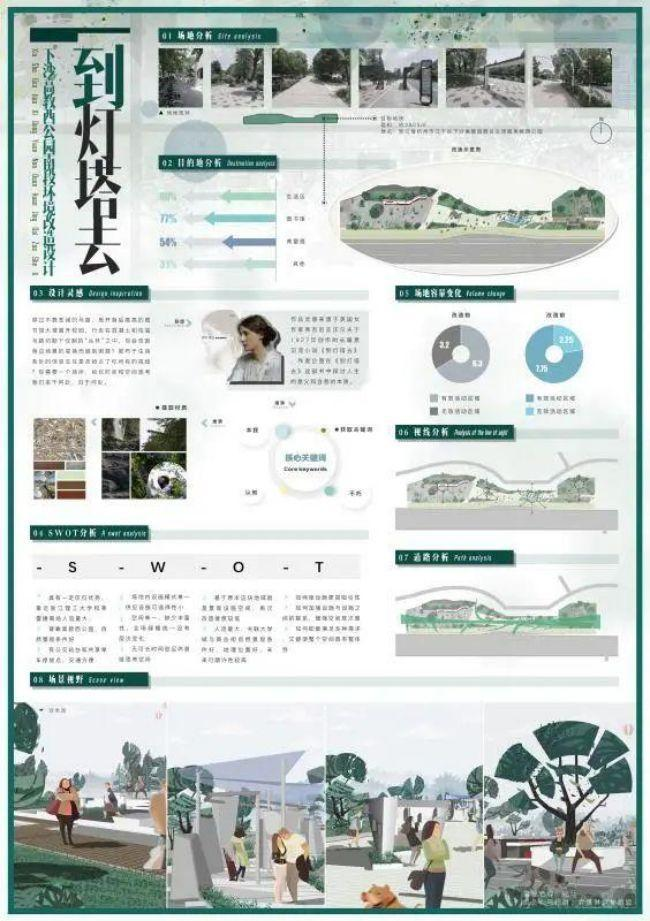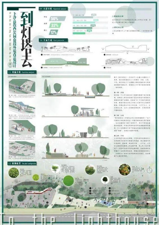 指导老师:姚珏设计说明:穿过不算宽阔的马路,甩开身后高高的图书馆大楼离开校园,行走在混凝土和柏油马路切割下仅剩的“丛林”之中,你会否因身边场景的变换而感到困惑?密布于生活各处的信息交互是否抢占了你所有的视线?你需要一个场所,给你时间和空间思考我们来于何处,归于何处。基于《到灯塔去》一书中对于人生重大问题的三个思考,我们将其提炼为三个关键词:本我,认知,不朽。我们将这三个主题融入景观设施的设计和场地的整体布置当中,希望游人行于其中能有所感悟,有所收获。
