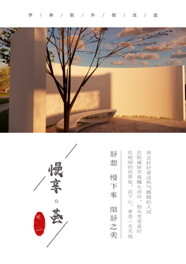 设计说明:当今社会大家都处在一个高压的环境下,或因学业繁重或因工作繁忙,每天行色匆匆,不由自主地步入快节奏的生活。“慢享荟”位于高校附近,绝大多数人只是纯粹地路过,很少会驻足停留片刻。