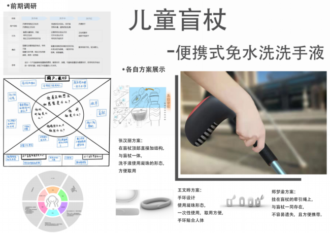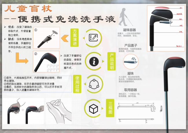 疫情让我们关注到了很多,平时被忽略的问题,譬如手部清洁消毒问题。那么,在后疫情时代,针对盲童这一特殊群体,他们既有儿童的好奇心,却又看不见眼前的物体。会触碰到各种未知物体表面,使手部充满细菌。针对这一现象,我们设计了一款免水洗洗手液与盲杖合二为一的新型盲杖。将洗手液设计成凝珠形态,并且在盲杖上增加凝珠的存储与使用装置。只需滑动就可将凝珠从存储容器内下落至凹槽,并且轻松取出。体现了对盲人儿童这一群体的人文关怀,并且让他们感受到了温暖。