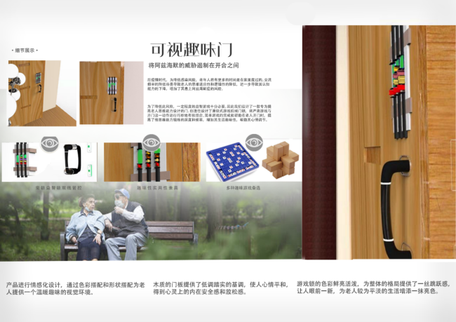 这是一款专为提高老人思维能力设计的门。后疫情时代,为降低感染风险,老年人将有更多的时间是在家里度过的。根据相关文献的查找,我们发现与其他人交流频率的降低容易导致老人的思维适应性和逻辑性降低,认知能力下降,增加了其患上阿兹海默氏症的风险。所以我们想在老人的日常用具中加入一点益智元素,帮助其锻炼思维能力。产品对开门这一动作进行设计,将简单严肃游戏与机械结构巧妙融合形成创意门锁,丰富了老人的开门方式。老人需将不同状态的滑块放入正确的位置,才能通过游戏打开门锁。通过这个简单的小游戏能锻炼老人的思维能力和认知能力,增加其生活的趣味性。