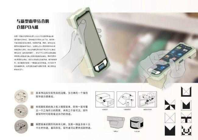 针对传统的“货架+人工”取件慢问题,就此本组改善传统电子面单信息的读取方式,将信息内容图形化、可视化,同时改进驿站扫描入库的PDA机。PDA机将与新型快递面单进行结合,当驿站工作人员使用该PDA机将快递扫码入库时,PDA机内部程序会使面单胶带出口自动伸出胶带(按照规律顺序),驿站工作人员可方便地将胶带贴到方箱包装的角,上或软袋包装的边缘处,同时使用PDA机将图形面单码、货架号等信息发给取件者。取件者取件时,能大概率在货架上一眼看到自己的快递,大大减少寻找快递的时间,从而达到改善驿站拥挤环境、减少取件总时长的目的。