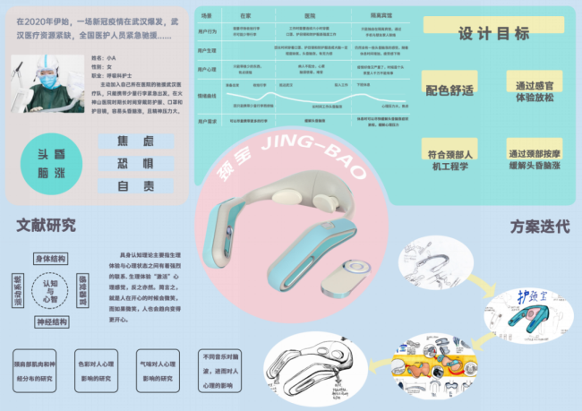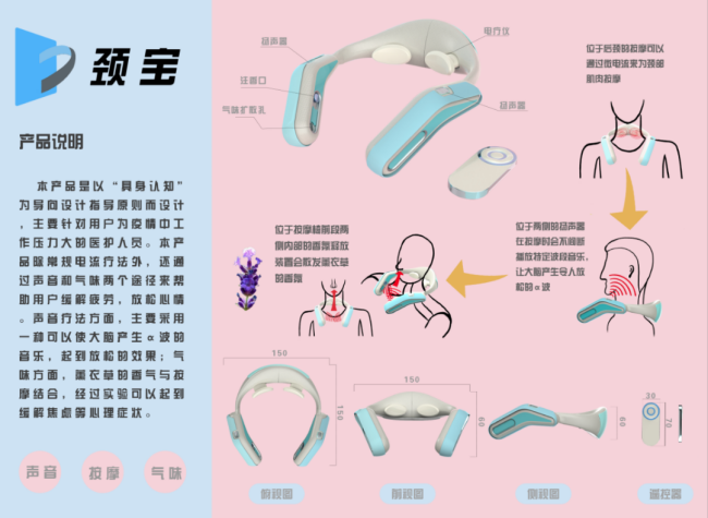 疫情的到来,给所有的医护人员带去了巨大的工作压力,他们的在负责隔离工作期间承受的过度的生理压力和心理压力,我们小组想要为他们做些什么。本产品是以“具身认知”为导向设计指导原则而设计。本产品除常规电流疗法外,还通过声音和气味两个途径来帮助用户缓解疲劳,放松心情。声音疗法方面,主要采用一种可以使大脑产生α波的音乐,起到放松的效果;气味方面,薰衣草的香气与按摩结合,经过实验可以起到缓解焦虑等心理症状。通过不同的感官在各方面为医护人员缓解疫情期间的身心负担。