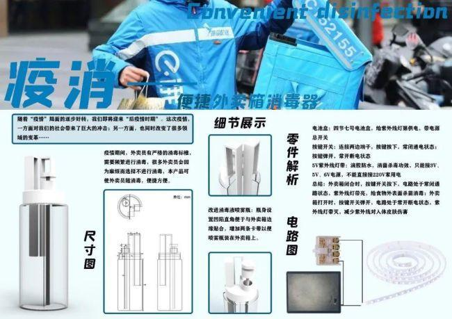 在后疫情时代,由于之前的疫情冲击,大家对消毒的需求远远高于现在,也更加倾向于点外卖而不是外出餐饮。由此外卖员的消毒情况也尤为受到关注,外卖员的消毒标准也有所提高,需要外卖员频繁的进行消毒,对此许多外卖员都会由于过程繁琐而不愿意消毒,我们设计的产品可将消毒品固定在外卖箱上方便外卖员消毒,同时内部的紫外线灯可以为外卖进行消毒,简化了外卖员的消毒过程,只需要简单按压就可以进行消毒。