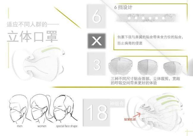 几乎没有一件医疗发明像口罩这样简单而实用,小小一方口罩承载了人类呼吸防护。理念和技术的进化史,也反映了人类对抗疾病与消解恐惧的历史。后疫情时代疫情还未离去,我们仍需要注意日常防护。可是现在的口罩和人们脸型并不适配,下颌、脸颊和鼻翼会有空隙,我们计算了中国人的脸型数据设计出了分三种尺寸,与中国人脸型贴合的口罩,充足的空间,满足对于脸的充分保护,免受病毒侵袭。