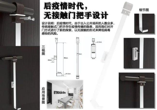 后疫情时代,由于出入公共场所的人数众多,传统接触式门把手存在疫情传播的隐患,因而我们对开门方式进行了新的探索,以无接触的形式来降低病毒感染的风险。该设计采用脚踏的方式,将产品与门把手相连接,用脚代替手来进行开门关门的操作,减少手直接接触门把手从而感染病毒的可能性。该设计是我们在疫情环境下对于人们出入公共场所的安全性的思考与探索,也包含了我们希望疫情早日结束的美好愿望。