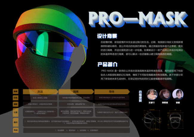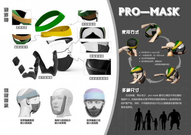 PRO-MASK是一款用在公共场合紧急隔离体温异常者的面罩。其内部采用了构型贴合人体脸部轮廓的记忆海绵,确保了不同脸型佩戴者的有效隔离。其下半部分采用了新型纳米多孔硅材料,在保证密封性的同时又能使佩戴者呼吸顺畅。