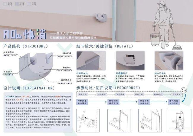 “ADa快消”旨在以人机工程为方法机制,满足用户对产品便捷性诉求的同时体现更多的人文关怀。综合产品固有属性和全新设计手法,最终形成极具未来感与科技感的简洁线条,为单调的工作注入新鲜血液。主要针对住院部的清洁人员,当用户将双手分别置入左右凹槽的感应范围内时,传感器会探测到人体红外光谱的变化,自动接通负载,喷出定量酒精的同时打开病房门锁。进入病房后,闭门器的液压部分通过压缩后释放,利用阻尼缓冲,在保护门框、减小噪音的同时,简化了步骤、减少了接触,实现了后疫情背景下的便捷性与持续性。